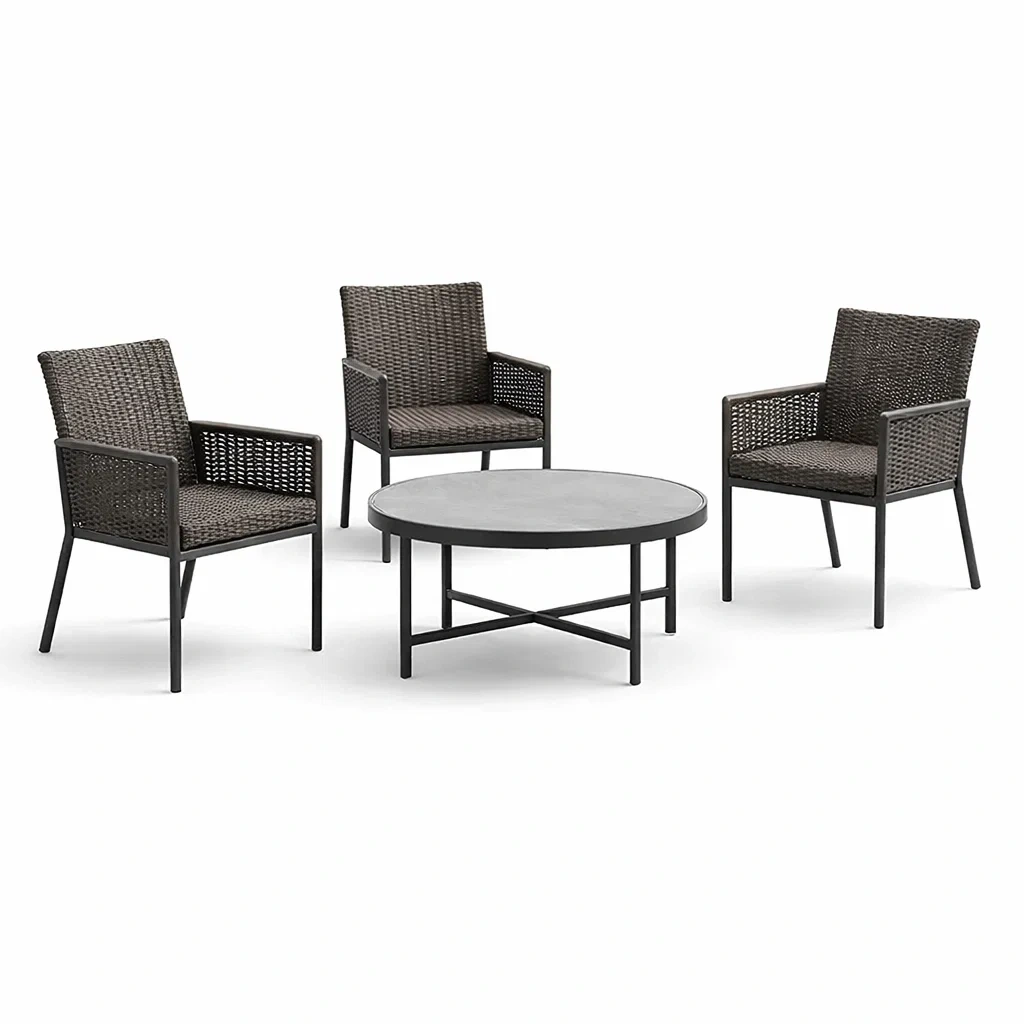 Questo set di mobili da giardino include tre sedie e un tavolino rotondo. Le sedie sono realizzate in rattan sintetico con telaio in metallo, Mentre il tavolino presenta una struttura metallica con piano in pietra artificiale.