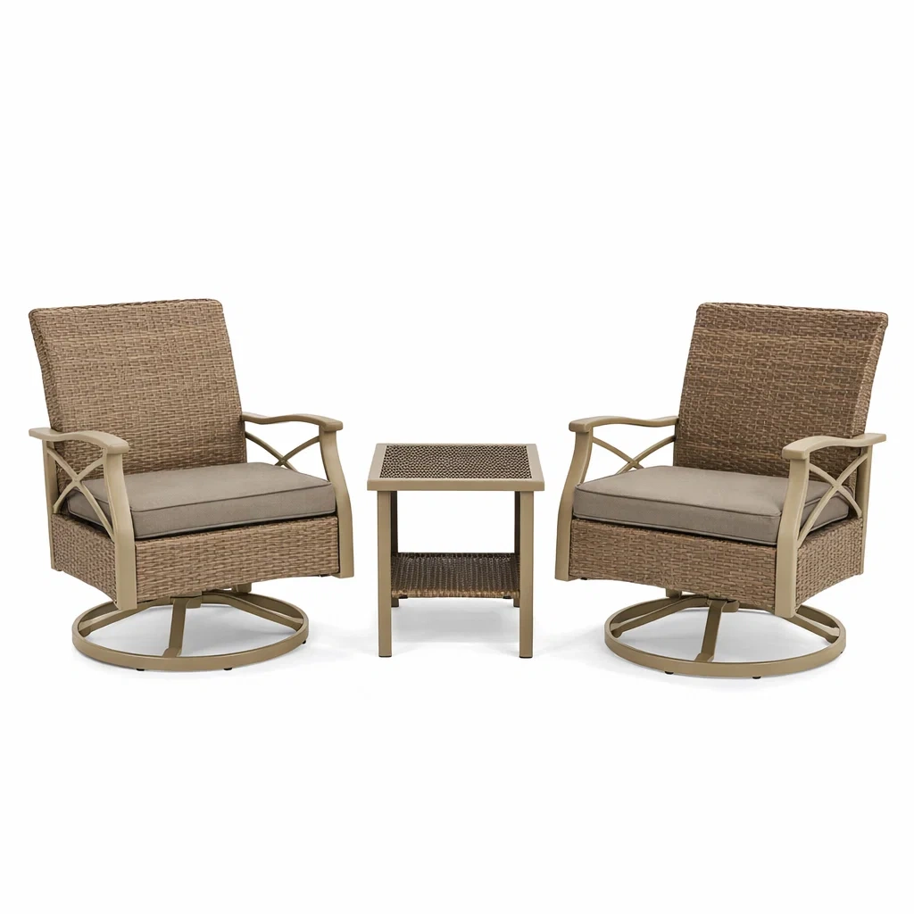 Set da giardino composto da due poltrone rotanti e un tavolino.